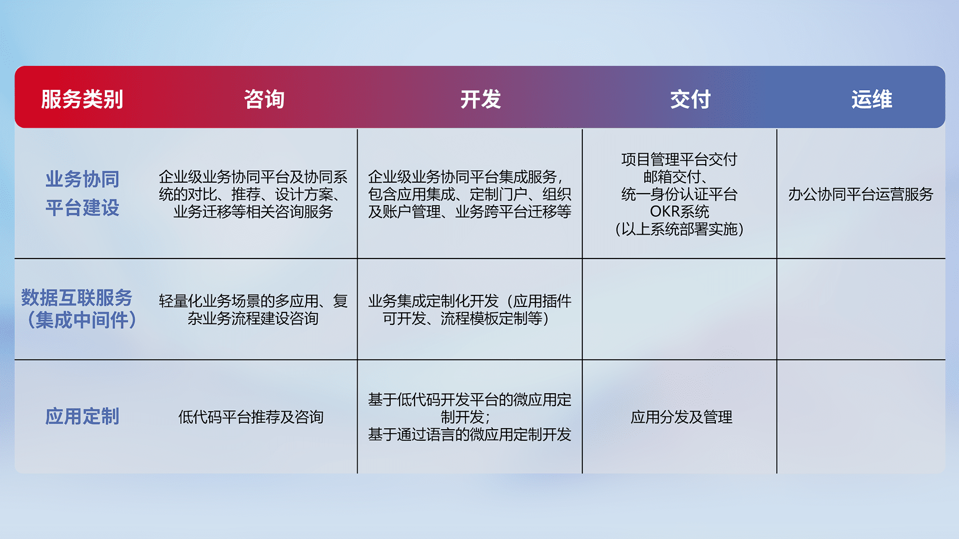 针对钉钉、、、、企微、、、IDaas等平台级产品提供产品的规划、、、方案、、交付、、定制化开发等服务,,,实现如统一协同办公、、、智能客户服务、、、、混合会议管理、、、、智能数据查询、、等业务场景,,实现数字化转型。。。。