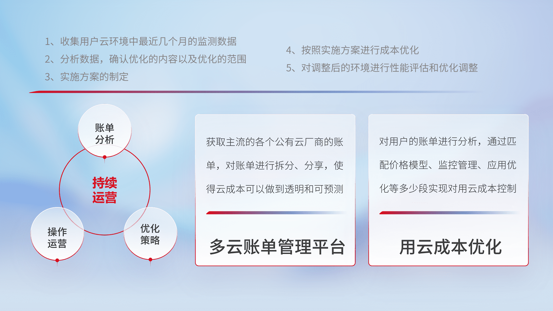 通过多云纳管,,,以统一的资源数据模型把客户的云资源进行抽象和封装,,进而实现对多云资源的统一操作,,保障云资源管理的可靠性、、、稳定性与可用性。。量身定制化运维内容,,配置、、开发运维、、、、补丁管理、、备份、、、监控、、、、认证和访问管理、、审计和日常巡检等,,,,保障在用云过程中的可靠度,,,,稳定度以及高可用率。。。