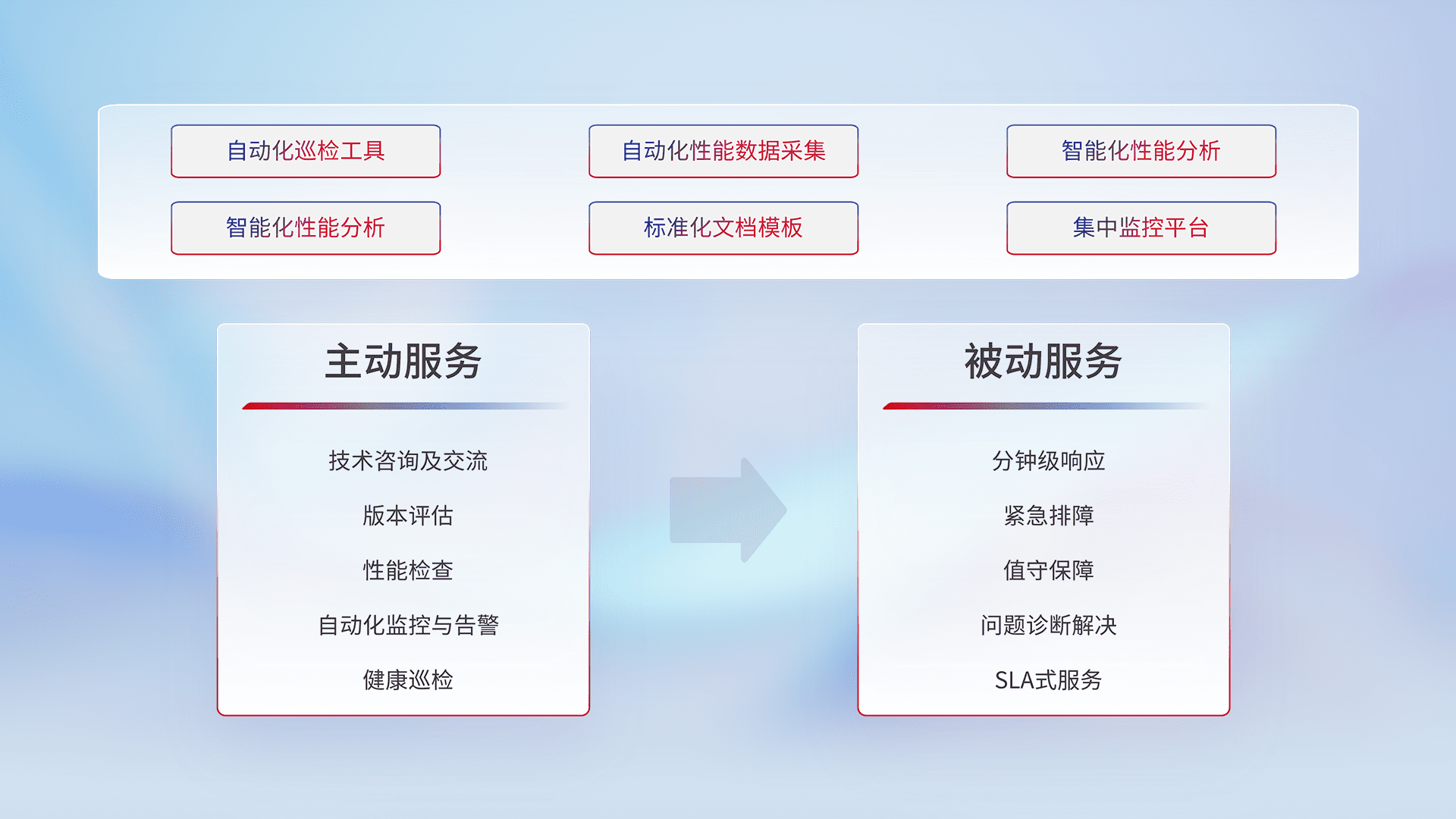 智能化工具和标准化文档,,,,保障服务质量,,提供主动服务(包含技术咨询、、、版本评估、、、、性能检查、、、、自动化监控与告警、、、、健康巡检)和被动服务包含(分钟级响应、、紧急排障、、、、值守保障、、问题诊断解决、、SLA服务)。。。